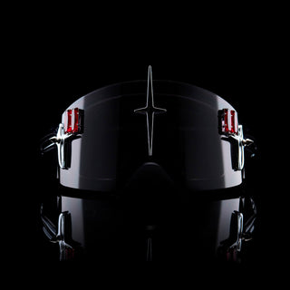 Signature high-gloss black goggles designed by Bjorn van den Berg featuring a signature mix of glamour, roughness with a futuristic twist. Embellished with metal chrome elements on the front. Finished with crystal details in the colors red and black. The goggles are adjustable at the back and come with a hard case cover.