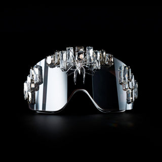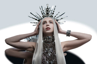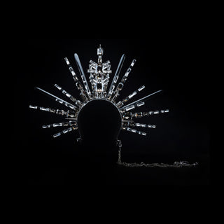 The base of the headpiece is embellished with spider details. To create a 3D, effect all the metal elements where laser cute and embellished and decorated separately with crystal stones in several shapes and sizes to give the headpiece a rich and bold outlook.