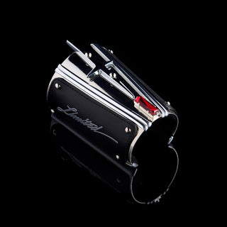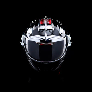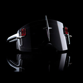 Signature high-gloss black goggles designed by Bjorn van den Berg featuring a signature mix of glamour, roughness with a futuristic twist. Embellished with Metal chrome elements on the front. Finished with crystal details in the colors red and black. The goggles are adjustable at the back and come with a hard case cover covercome with a hard case cover.