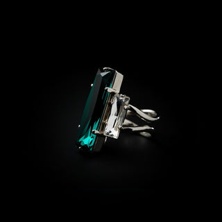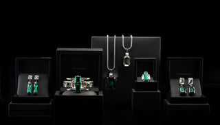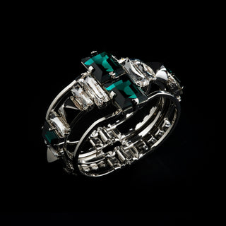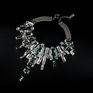 The limited editions are true collector items, a spectacular necklace, a bracelet, large earrings, all handset with clear crystals in various shapes and sizes highlighted with emerald green elements. finished with a fine layer of pure platinum. The jewelry items are handmade produced in limited numbers, in our atelier in Europe.