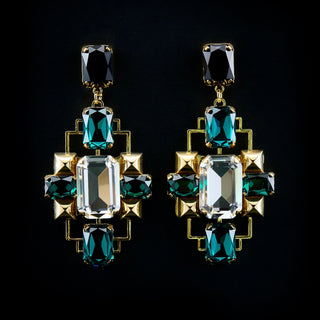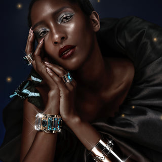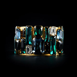 Enter a world of unparalleled elegance with the Blue Crystal Garden jewelry collection—an exclusive curation of five exceptional designs that redefine festive sophistication. Featuring two unique bracelets, XL clip-on earrings, a statement pendant, and a show-stopping necklace, each piece is meticulously crafted in 24k gold and adorned with hand-set crystals in shades of teal, emerald, and clear....